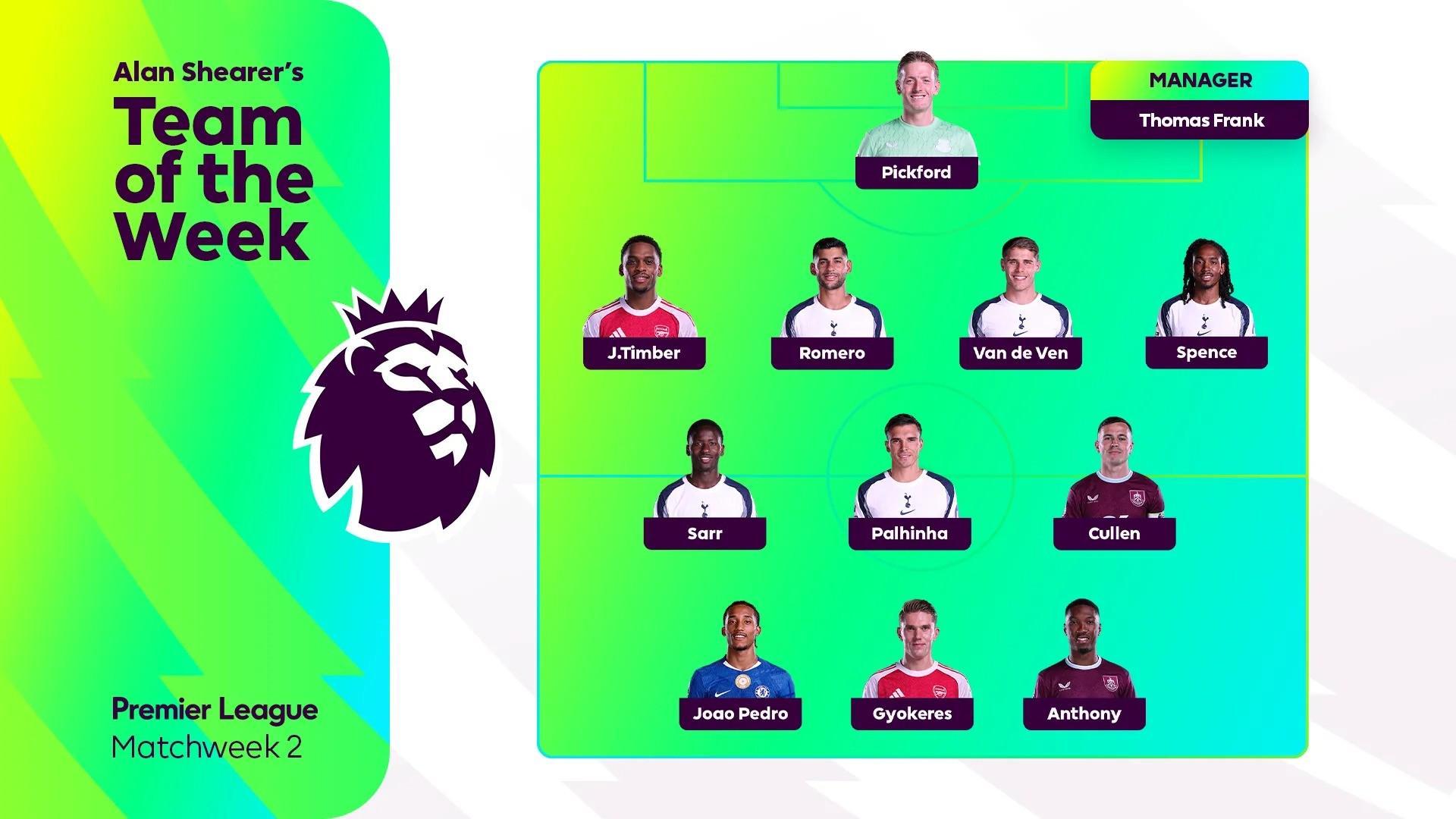 英超官方发布了阿兰-希勒评选的英超第2轮最佳阵容,哲凯赖什领衔,热刺五名球员入选。